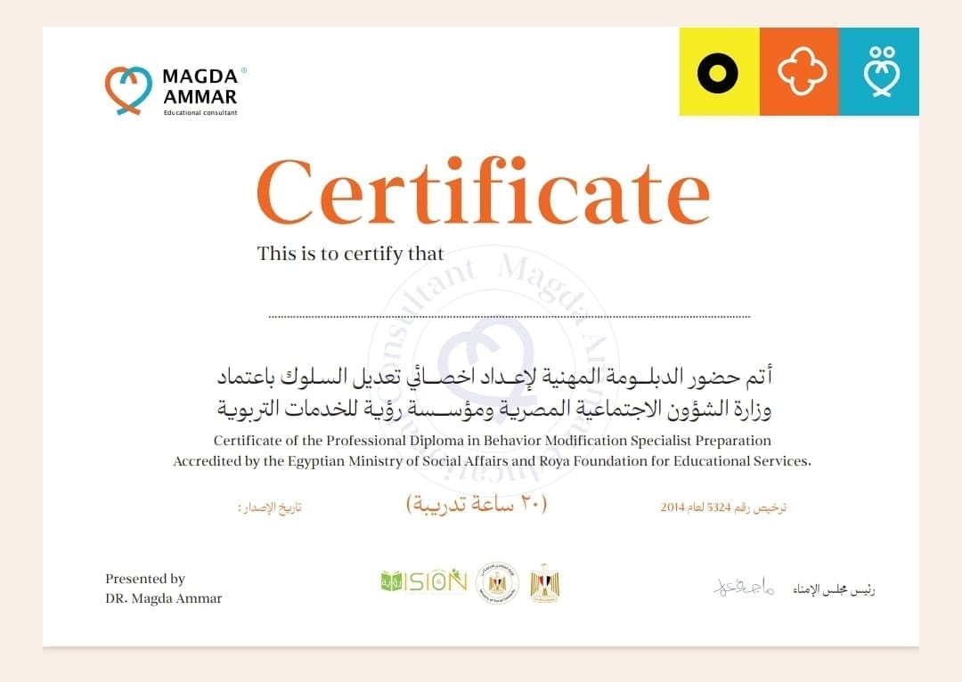 ستحصل على شهادة معتمدة من وزارة الشؤون الاجتماعية ومؤسسة رؤية للخدمات التربوية، تؤهلك لمزيد من الفرص الوظيفية في المجالات التربوية والنفسية.
